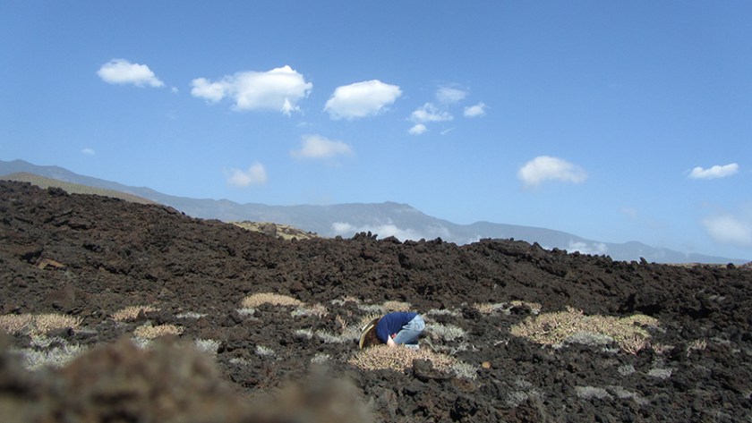 This work was developed in the context of my participation as an instructor in the fieldtrip of Oxford University’s Biodiversity, Conservation and Management MSc to Tenerife. It draws on a local legend about the volcanic site where the performance took place, called the Badlands of Güímar, the difficult conservation situation, and the biology of seeds washed on the hostile rocks, which somehow manage to establish themselves under the right conditions. I published a description of the work along with some student art projects also made on-site (see A’Bear et al. 2017 Leonardo).