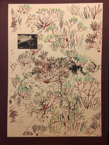 This work consists of two coloured pencil drawings on paper, that have been cut into strips and woven together. The images of “things we don’t understand” and “things that are ambiguous” are redrawn from photos and field notes from a project in the so-called “slid sites” in Brunkulslejer, Denmark, in which I collaborated with my anthropologist colleague Mathilde Højrup to construct a natural history of these anthropogenic transformed sites. The slid sites are rather strange, being areas where vibrations from large tree-harvesting equipment caused super-saturated sandy soil to buckle into 3-m high linear undulations. The resulting low marshy areas and high peaks have been recolonized by various plants and animals. I was interested in our process of interpreting things we saw in the environment: what was completely mysterious to us, what could we only partially interpret, what eluded a single explanation and might indicate more than one thing?