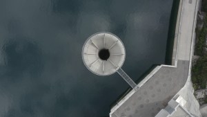 Drone view of hydroelectric dam building structure, Lac de l’Hongrin, Canton of Vaud, Switzerland.