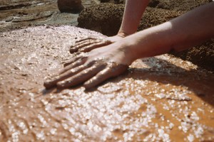 The meshwork of soymilk, fermented wool and cotton covered in mud with a high content of red ochre, also known as Iron Oxide – a result of decades of a not so romantic waste from iron mining leaching into the soil – sunbathed and rinsed. Red Ochre derived from the earth was the earliest communications bridge – think cave paintings. Thought to reality, reality to spirit, a mechanism for change, a thread linking groups and communities as they evolved, grew and spread.