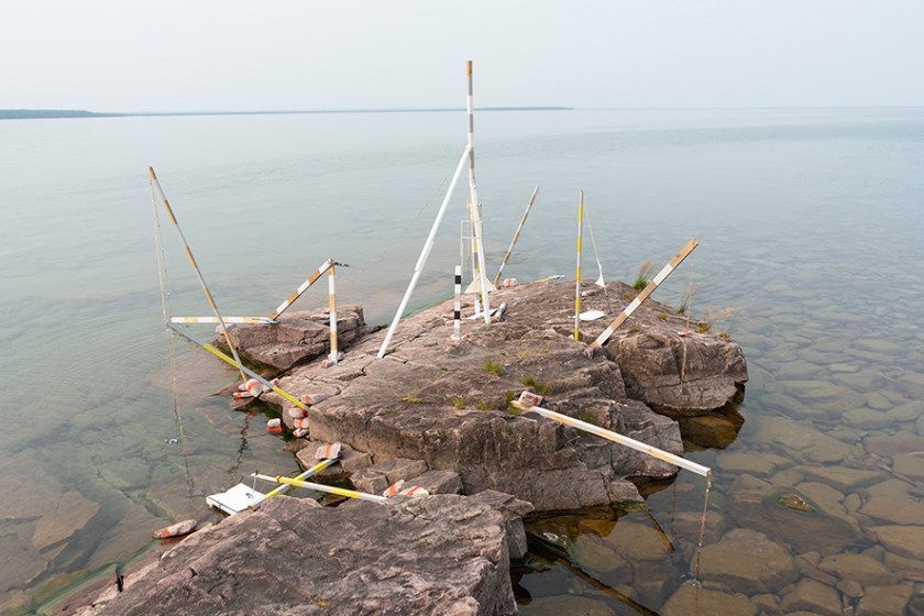 Keweenaw Observing Station is a collaborative multimedia artwork that examines the effect of climate change on Lake Superior and the Great Lakes System. The work consists of a series of site responsive, portable sculptures that function as observational stations/instrumentation as well as repositories of information. These sculptures are inspired by the NOAA monitoring systems used locally such as the Great Lakes Water Levels Monitoring Network. The instruments poetically measure wind, waves, visibility, water-level and temperature, exploring both the possibilities and limitations afforded by perceptual observation. Within the artwork our observations will be contextualized vis-a-vis large, ongoing collections of data via satellite imagery, scientific instrumentation, human memory and citizen science intended to help predict the future of the lake. The project touches upon the lake as a “site of memory” by examining how winter conditions contribute to subsequent summers, while also engaging human memory by exploring indigenous observations of the landscape.