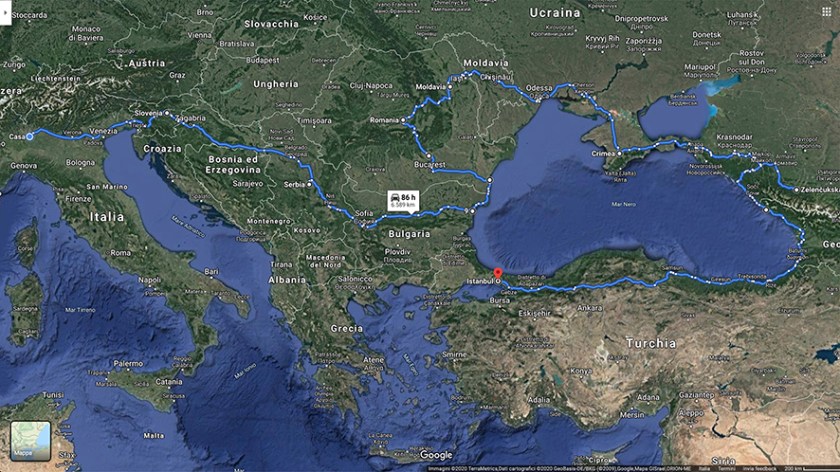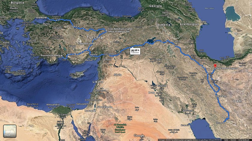 In Iran, they never had a strict quarantine imposed on citizens like in Italy and Europe. The Government simply invited them to stay at home. Friends told me, for example, how no one rushed in hopelessness to the shops: the usual social and political situation has accustomed them to many renouncements, and it is better to avoid the rise of goods prices that would penalise the poorest sections of the population. The stories of what happens and where they want to take me while visiting and researching, created every day a series of ‘optical illusions’ and ‘hypothetical trips’ along the streets of Tehran, Isfahan, and Shiraz. An itinerary, when only imagined, does not succeed in restoring the distance or the amplitude of a place: it will be images, as well as drawings and maps that will tell a real dimension, even temporal. After months of dialogue, this journey became a symbol of resistance, of solidarity, of shared desire: to see each other. So I decided to depart, questioning of my art practice and the meaning of fieldwork: one-way from Milan to Tehran by car, remotely.