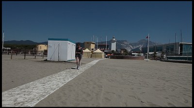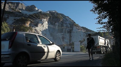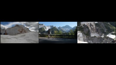In response to the energy and waste intensive quarrying, its environmental impact and its irreversible damage to the landscape, I walked 14km, twice, from the mountain village of Colonnata to the beach adjacent to the Port of Marina Di Carrara carrying my body weight in marble dust. In the 10 hours that it took me to walk and waste 49kg of marble dust the trucks that passed by me transported loads of approximately 2588997.5456621004kg. This film project was made during a 10 day visit to Carrara in the summer of 2016, I filmed the two walks myself, walking back and forth to my camera on a tripod and with Go -pro cameras attached to my legs and arms. The act of carrying my body weight in marble powder aims to draw attention to the weight of my body, and its equivalence in matter. Leaving a trail of powder in my wake as I walk, draws attention to the physical, material and essential presence of both myself, the marble and the mountain. The gesture of wasting the marble asks questions about the value of me, the value of the marble and the value of the mountain. Drawing a continuous bright white 14km line of dust from the mountain to the beach made me feel both unnervingly powerful and present while also utterly insignificant and irrelevant.